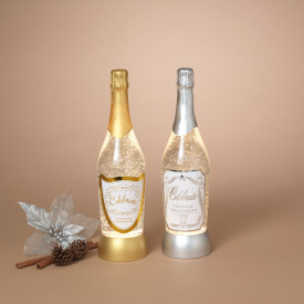 CHRISTMAS LIGHTED SPINNING WATER GLOBE CHAMPAGNE BOTTLE W/ TIMER, 2 ASST MODEL: 2803560 SIZE: 13.75″H