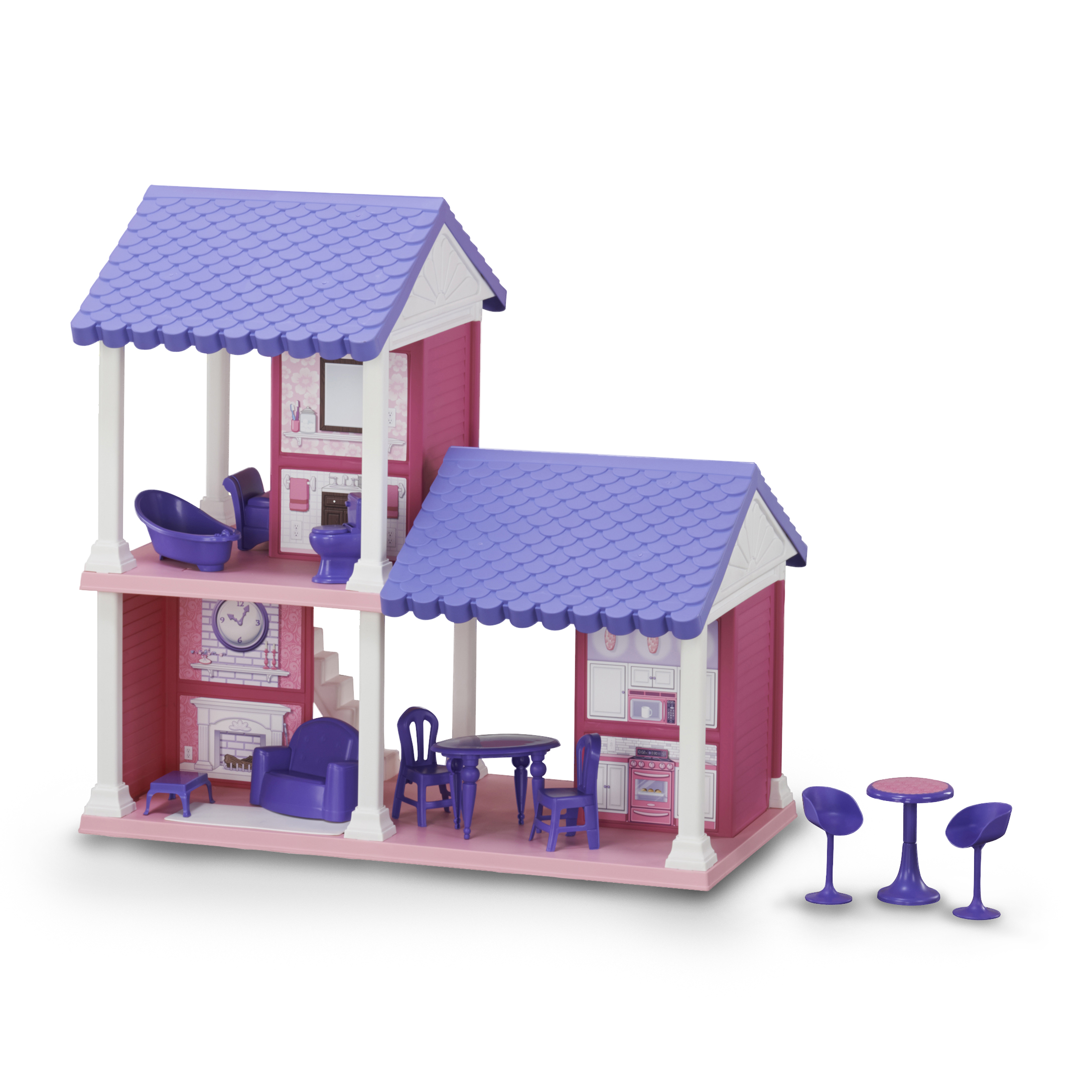 Every doll needs a home and this cozy cottage is a beautiful place for them to live! This 2 story home is an open-air design, allowing for play from all sides. 13 household items add to the fun and give kids a place to make a home for their dolls. Crafted from strong and durable pplastic, this house has beautiful pinkn and purple accents.