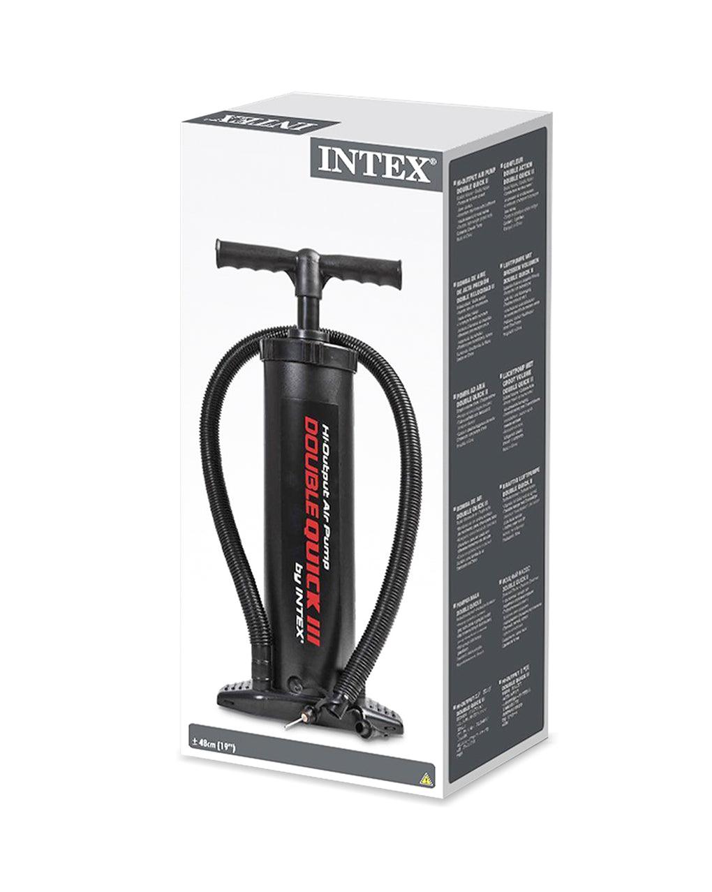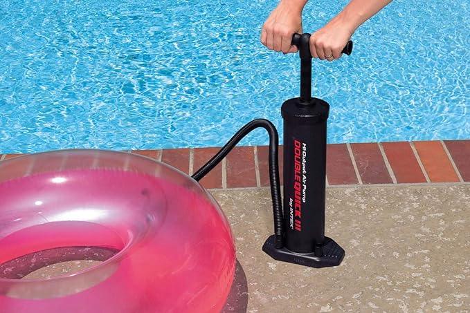 This take-anywhere, hi-output Double Quick III Manual Hand Air Pump from Index makes inflating pool floats, lounges, and sports balls a breeze. This innovative hand pump will pump air on both up strokes and down strokes as well as inflate and deflate your pool floats and toys for maximum efficiency. The Double Quick III includes a needle, an accordion hose with three interconnecting nozzles designed to fit valves found on common inflatables. Standing at 19-inches tall, the Double Quick III does not require a plug, batteries or electricity and is built to last. Index Model: 68615E.