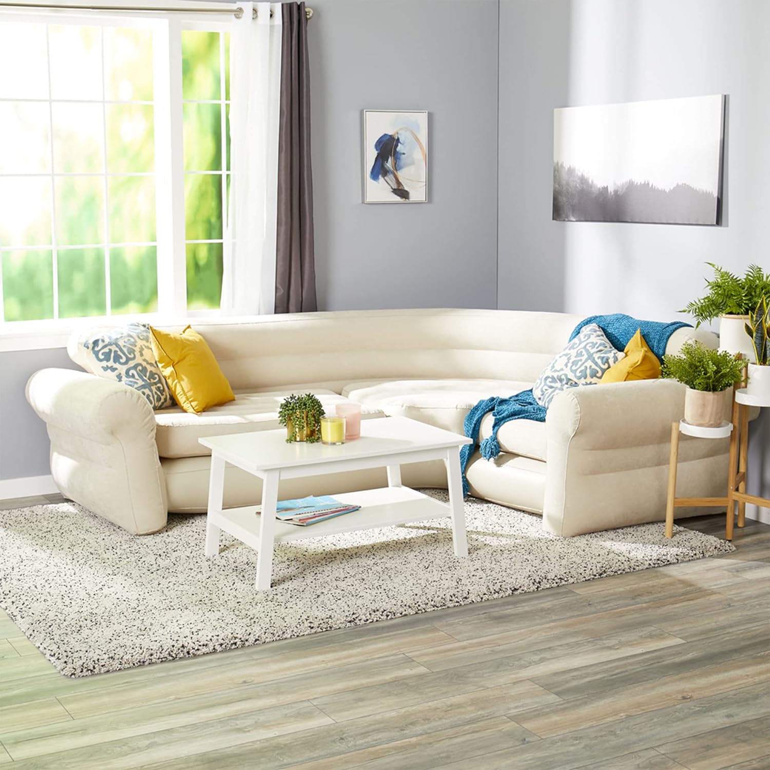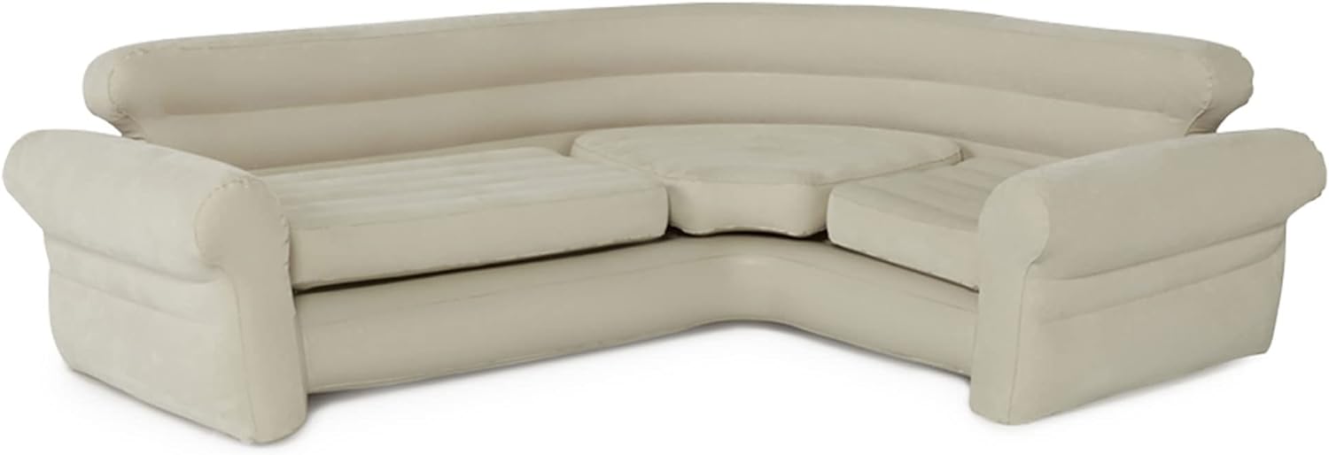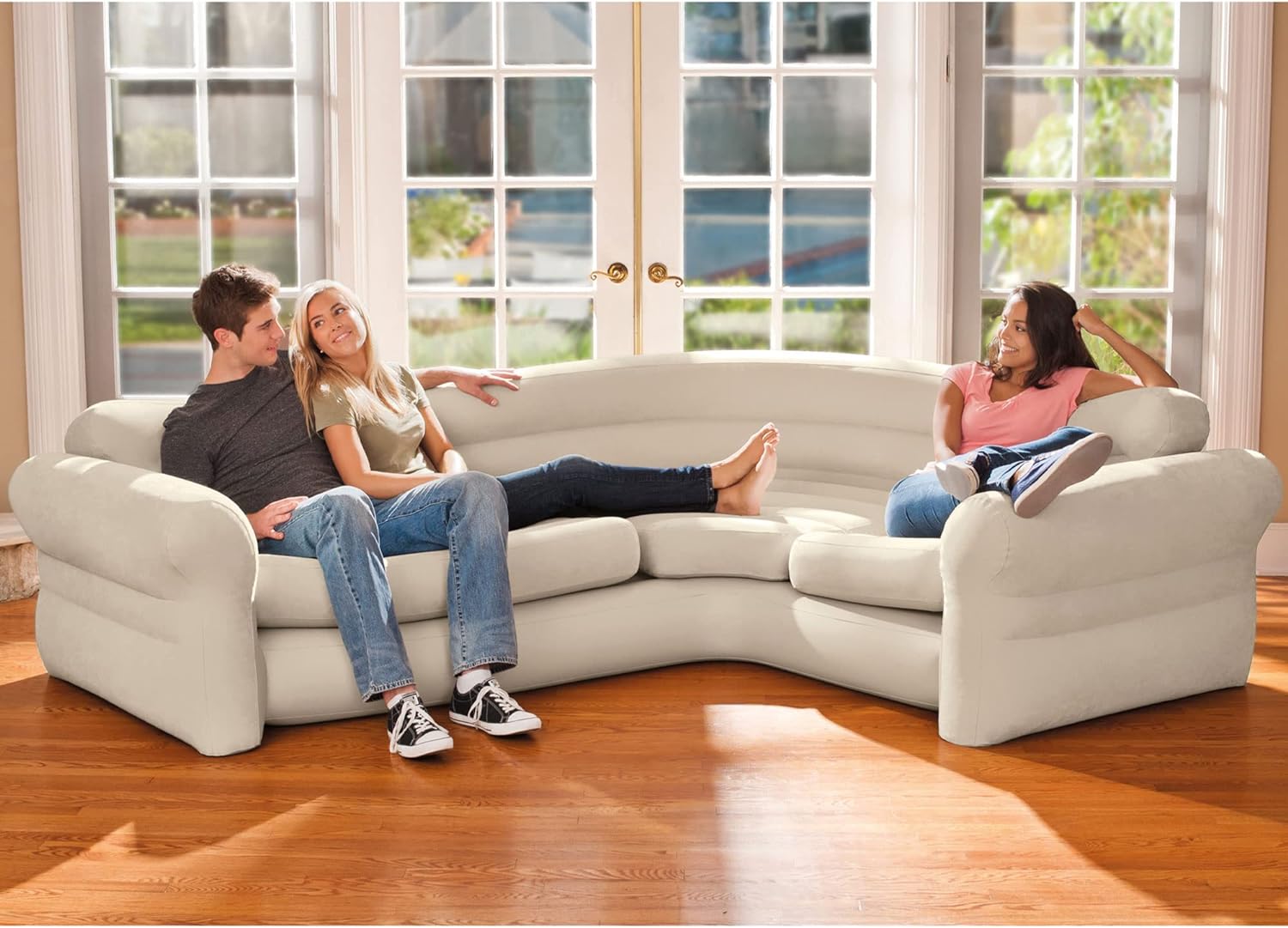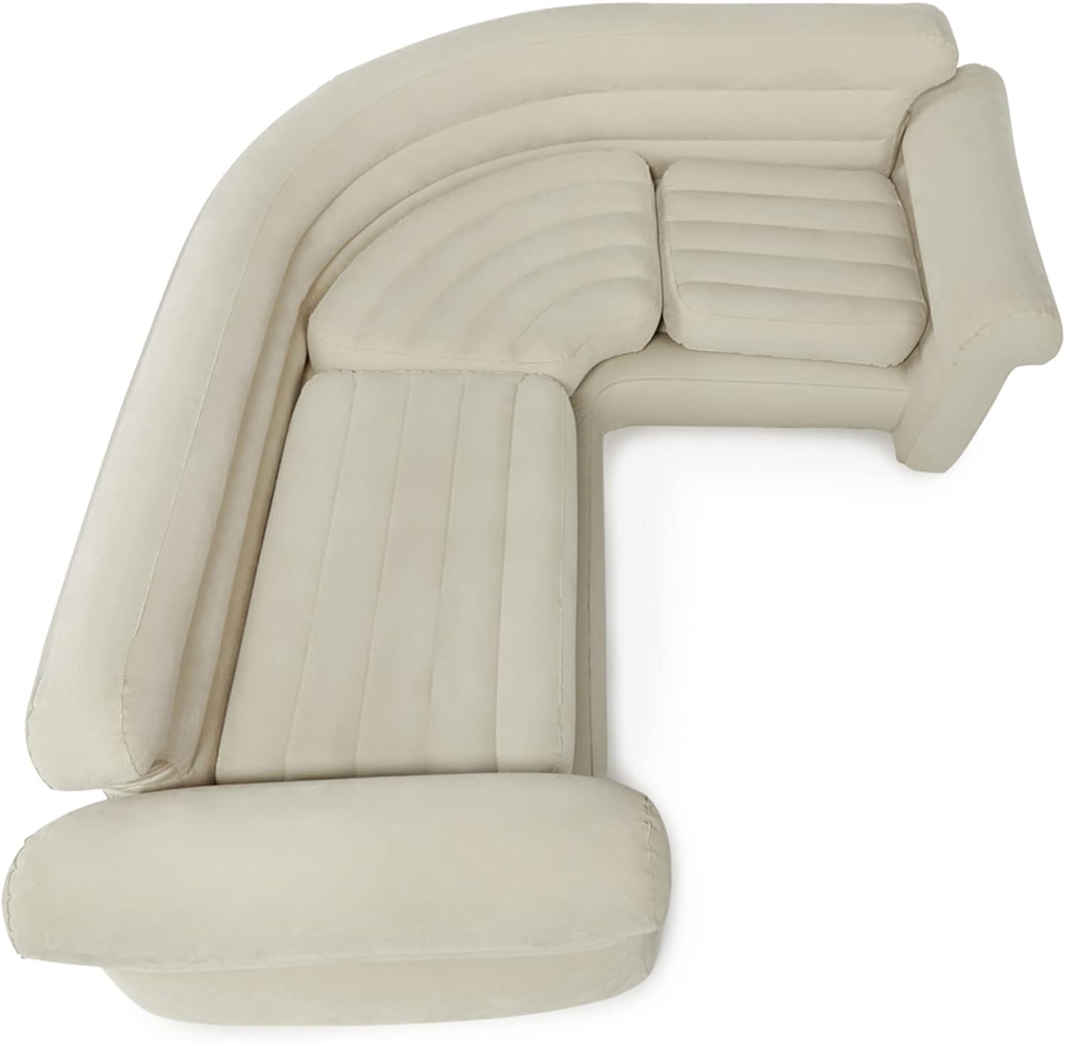 The Intex Corner Sofa is a fantastic addition to any living room with spacious seating and a neutral color to suit any home decor. Luxurious, yet convenient, this couch is designed with deep seats and wide armrests for a practical and sophisticated appeal. Designed with a waterproof-flocked top surface and a vinyl bottom, this sofa provides an incredibly comfortable sitting surface for any occasion. A 2-in-1 valve with extra-wide openings ensures fast inflating and deflating. Upon deflating, the Corner Sofa folds compactly for storage or travel. Approximate inflated size 101” x 80” x 30”. Weight capacity 880 lbs.