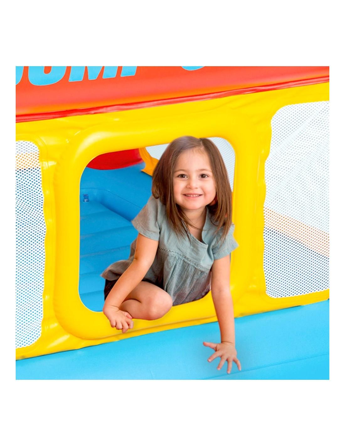 Perfect for jumping and playing, the Intex® Playhouse Jump-O-Lene® is a great play gym for young kids to enjoy for hours on end. This colorful bouncer comes equipped with a crawl-thru door for kids to easily crawl inside. Reinforced net sidewalls provide a safe enclosed play area. An inflatable floor and high sidewalls provide a safe bouncing platform.