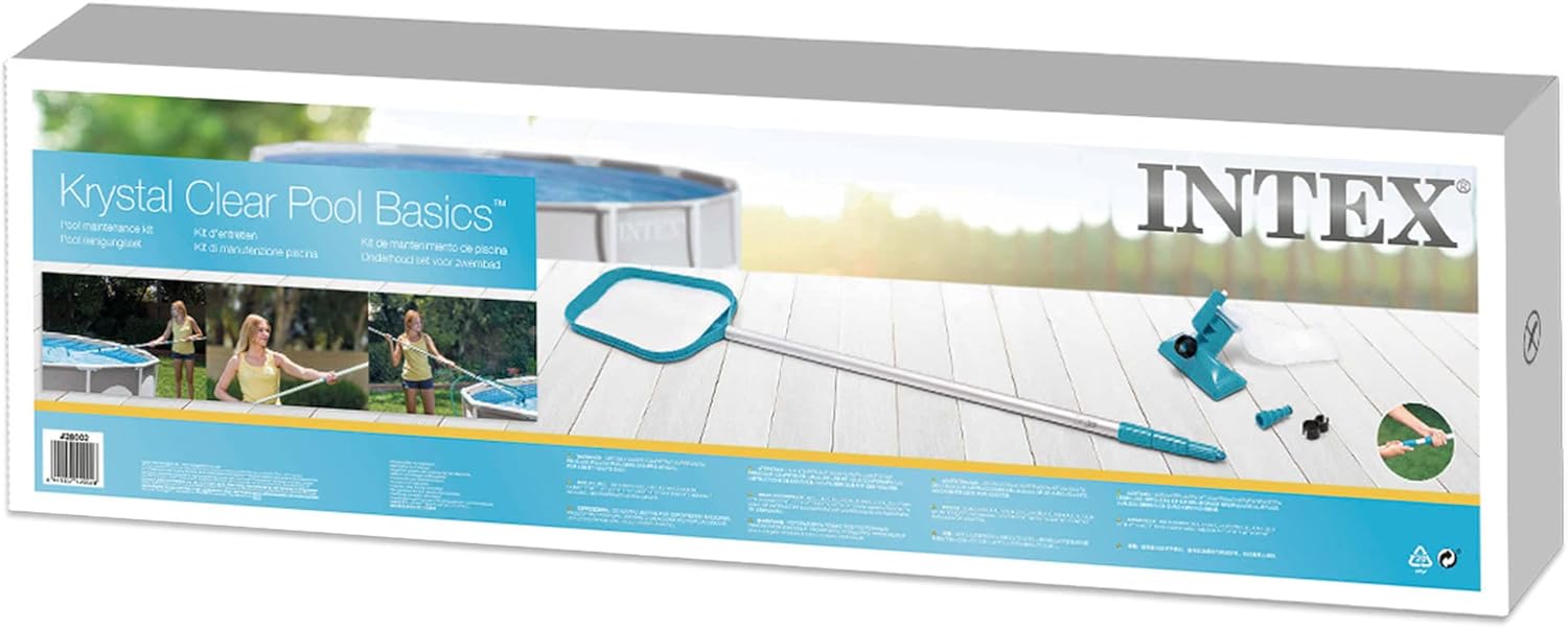 The ultimate in pool maintenance kits, the Intex Deluxe Pool Maintenance Kit is perfect for keeping Intex pools clean and fresh for swim time. This kit includes a 110in telescoping aluminium shaft for use with 18ft diameter pools and above. The kit also includes a vacuum that sucks debris off the pool floor and through the filter (requires an Intex filter pump with a minimum flow rate of 800 gph (3,028 L/hr) and can attach to the outlet connector in the pool with a 24ft 7in hose. The telescoping aluminium shaft can be used with the following included attachments: vacuum head, durable and deep mesh skimmer net, and wall brush attachment.